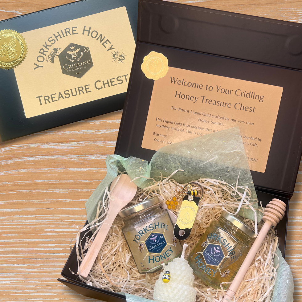 Inside this treasure chest you will find: 1x112g Cridling Yorkshire Runny Honey, 1x112g Cridling Yorkshire Soft Set Honey, 1 Beeswax Candle, 1 wooden honey drizzled, 1 wooden honey spoon and a keyring all presented on a bed of wood wool.